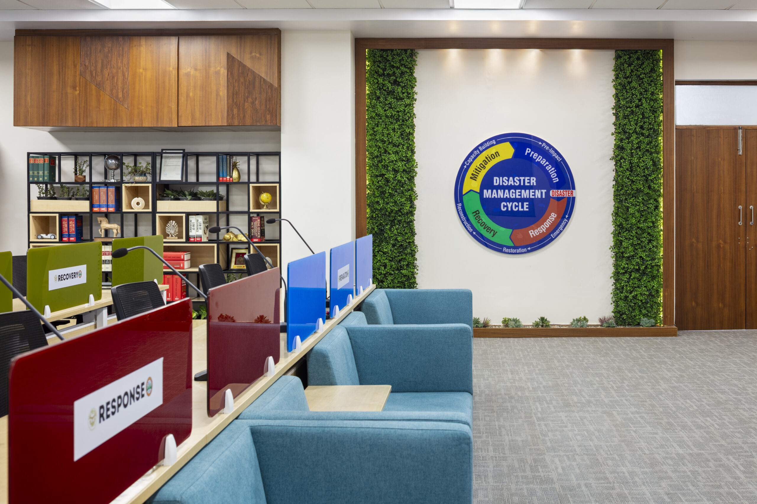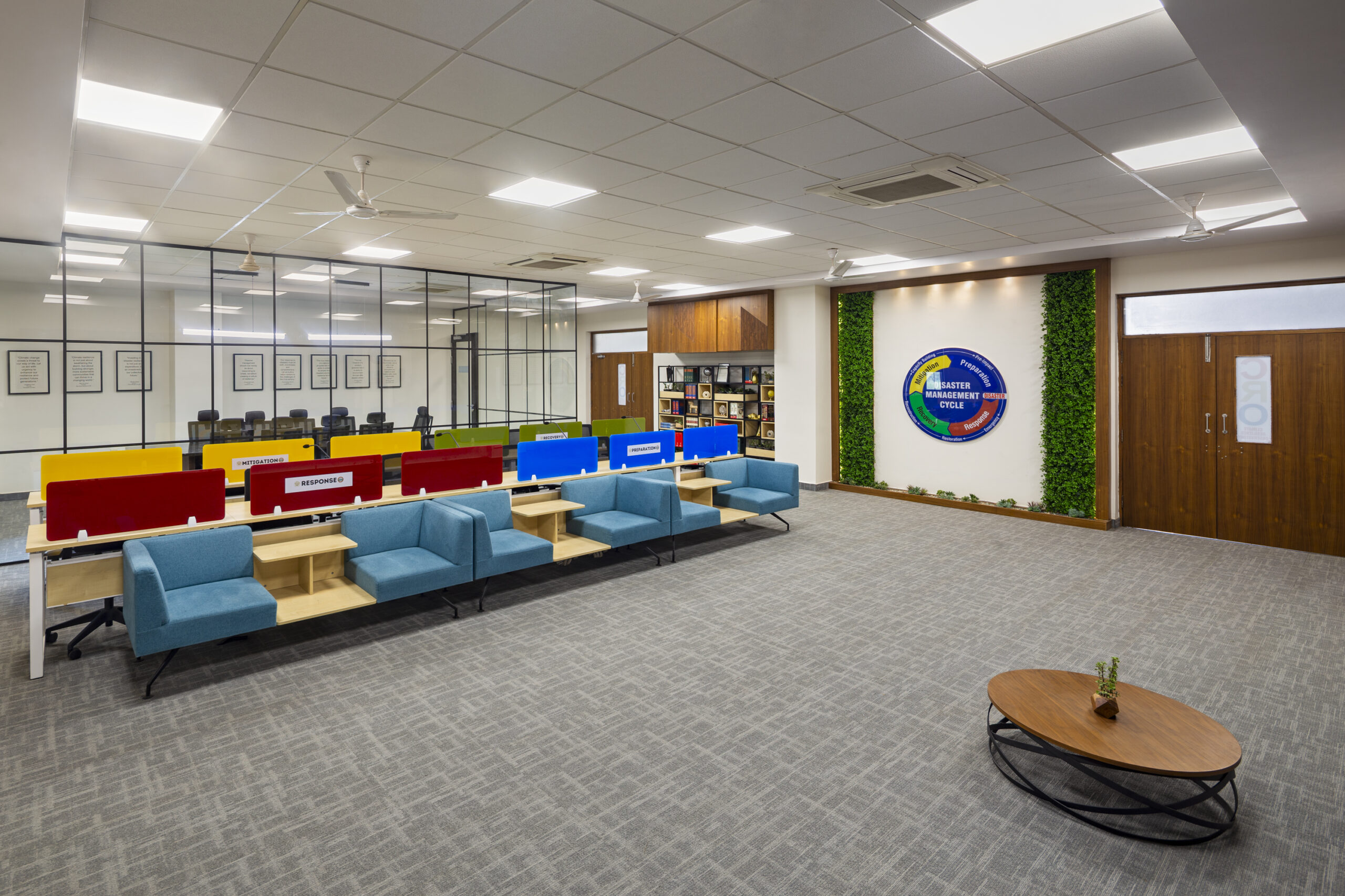 Every detail was purpose-driven colour-coded work zones were introduced to represent each department: 🔴 Response, 🔵 Preparation, 🟢 Recovery, and 🟡 Mitigation. A massive digital screen formed the visual centrepiece, enabling continuous updates and monitoring.
