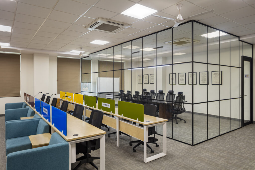 • Glass-Partitioned Meeting Room: For privacy during discussions while maintaining an open visual line.